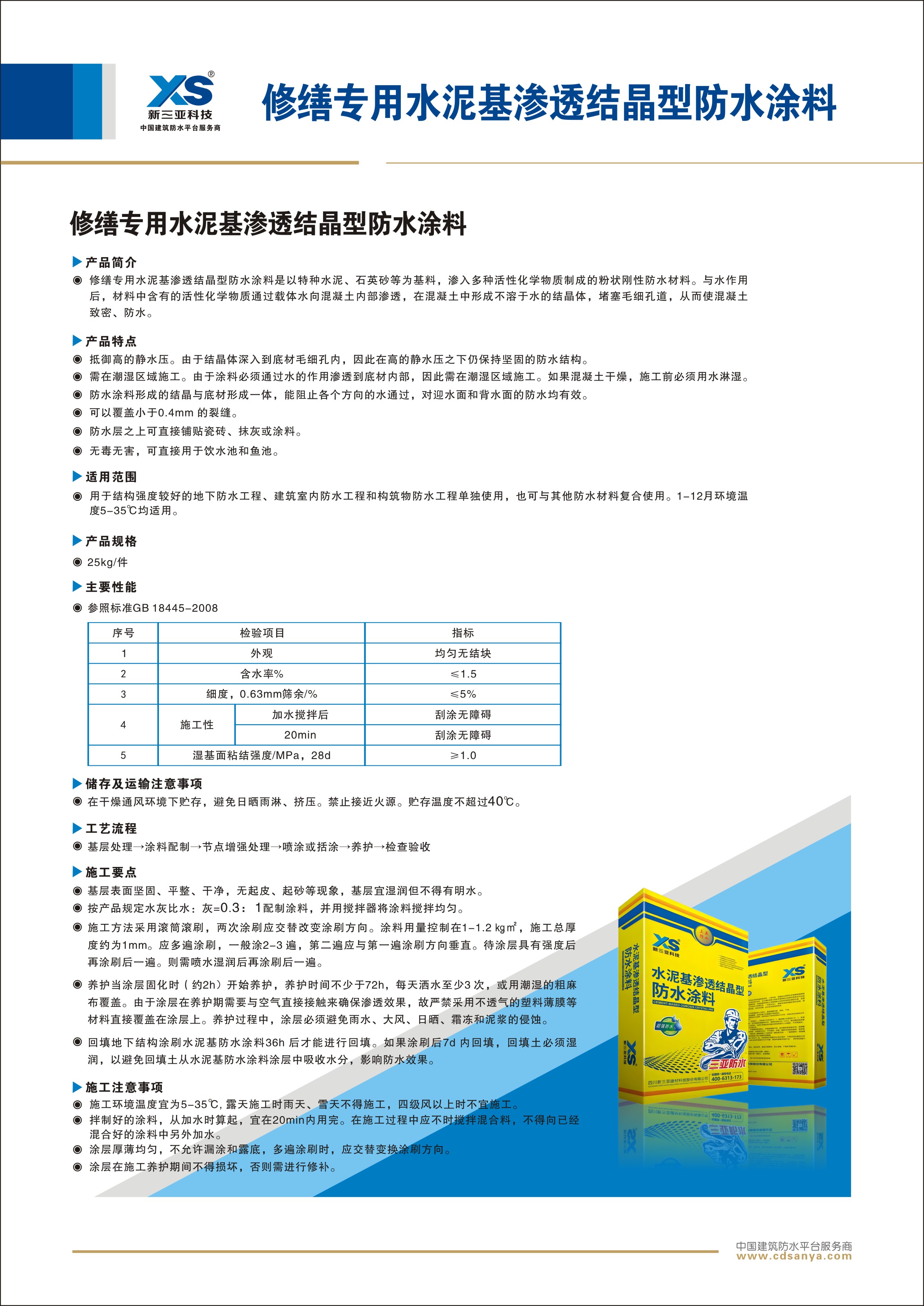 產(chǎn)品特點(diǎn): 1.抵御高的靜水壓。 由于結(jié)晶體深入到底材毛細(xì)孔內(nèi), 因此在高的靜水壓之下仍保持堅(jiān)固的防水結(jié)構(gòu)。 2.需在潮濕區(qū)域施工。 由于涂料必須通過(guò)水的作用滲透到底材內(nèi)部, 因此需在潮濕區(qū)域施工。 如果混凝土干燥, 施工前必須用水淋濕。 3.防水涂料形成的結(jié)晶與底材形成一體, 能阻止各個(gè)方向的水通過(guò), 對(duì)迎水面和背水面的防水均有效。 4.可以覆蓋小于 0.4mm 的裂縫。 5.防水層之上可直接鋪貼瓷磚、 抹灰或涂料。 6.無(wú)毒無(wú)害,可直接用于飲水池和魚(yú)池。 參考用量:1mm:2~2.5kg/m 2(具體因基面粗糙度而定) | ![]() |